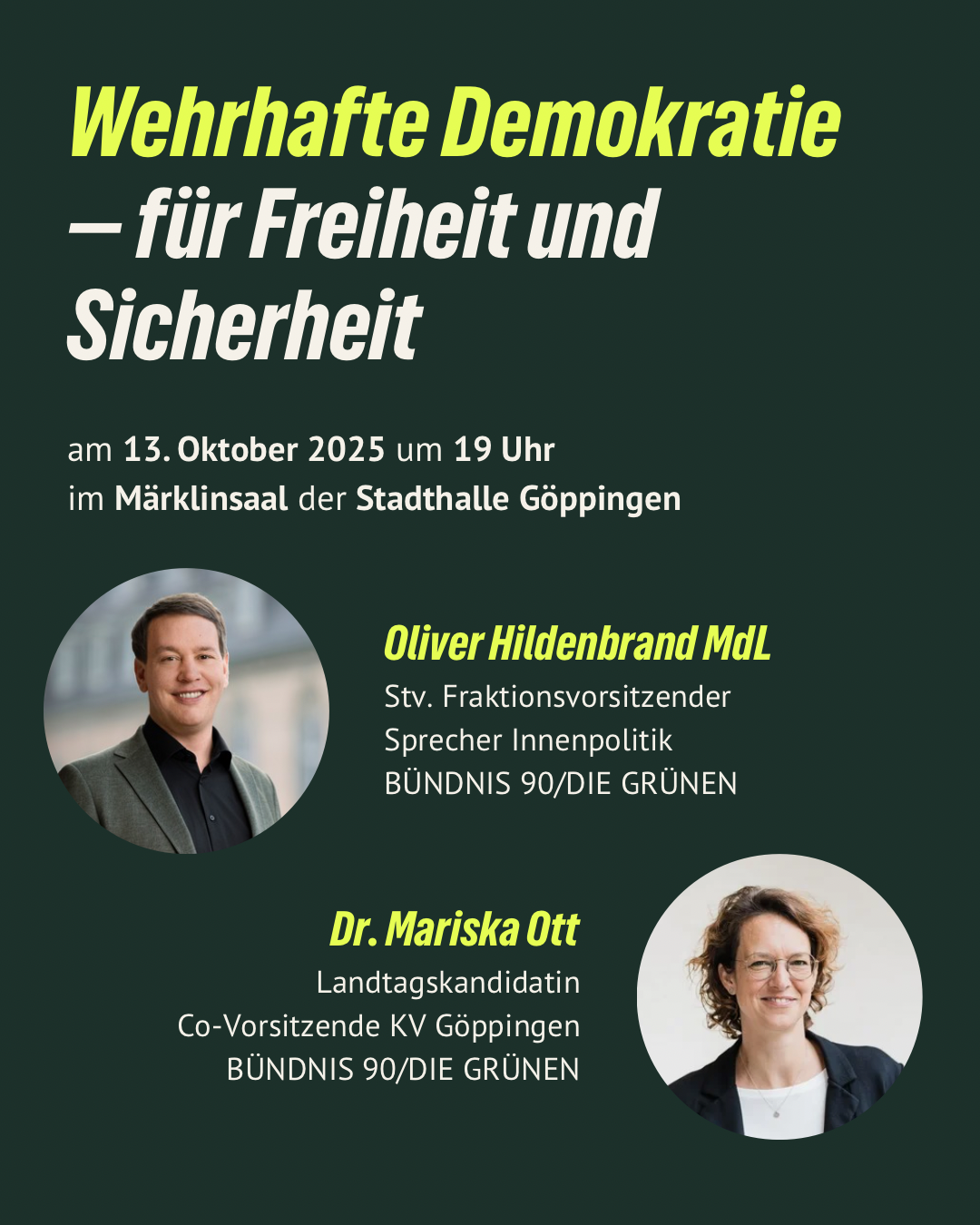 Wie schützen wir unsere Demokratie und unsere Verfassung? Wie wehren wir uns gegen Rechtsextremismus? Was können wir gegen Desinformation und Fake News tun? Über diese und weitere Fragen sprechen am Montag, 13. Oktober 2025, um 19.00 Uhr im Märklinsaal der Stadthalle Göppingen der Stuttgarter Landtagsabgeordnete Oliver Hildenbrand und die Göppinger Landtagskandidatin Dr. Mariska Ott.
